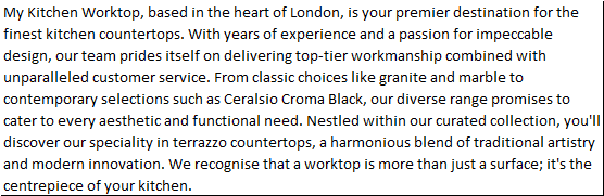 My Kitchen Worktop, based in the heart of London, is your premier destination for the finest kitchen countertops. With years of experience and a passion for impeccable design, our team prides itself on delivering top-tier workmanship combined with unparalleled customer service. From classic choices like granite and marble to contemporary selections such as Ceralsio Croma Black, our diverse range promises to cater to every aesthetic and functional need. Nestled within our curated collection, you’ll discover our speciality in terrazzo countertops, a harmonious blend of traditional artistry and modern innovation. We recognise that a worktop is more than just a surface; it’s the centrepiece of your kitchen.